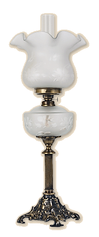 Traditional, table paraffin lamp, height about 70 cm with a sandy and polished glass of the container for the paraffin. Its patina base is made of a cast and brass metal sheet. The burner and the flange which supports the sandy and abraded tulip-shape shade are made of patina, brass metal sheet. Green, ruby, cobalt and transparent colours of containers are also available. Its parts are brass, patina or polished. Weight about 4.4 kg.