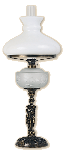 Traditional, table paraffin lamp, height about 65 cm with a sandy and polished glass of the container for the paraffin. Its patin base with the image of a woman is made of brass cast. The burner and the flange which supports the sandy and abraded tulip-shape shade are made of patina, brass metal sheet. Green, ruby, cobalt and transparent colours of containers are also available. Its parts are brass, patina or polished. Weight about 4.4 kg.