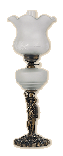 Traditional, table paraffin lamp, height 45 cm, with a sandy glass container for paraffin. Its patin base with the image of the goddess Amalthei is made of brass cast. The burner and the flange which supports the sandy and abraded tulip-shape shade are made of patina, brass metal sheet. Green, ruby, cobalt and transparent colours of containers are also available. Its parts are brass, patina or polished. Weight about 1.7 kg. |