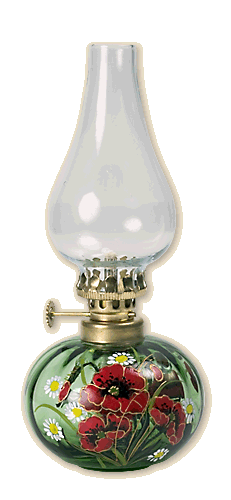Table paraffin lamp, height about 19 cm. Burner made of polished, brass metal sheet. Green, ruby, amber and transparent colours of containers for paraffin are available. Its parts are brass, patina or polished. Hand-painted container for paraffin with traditional plant motifs. Weight about 0.2 kg. |