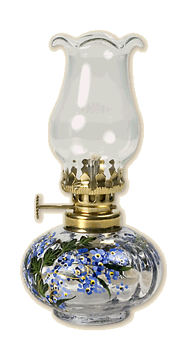 Stołowa lampka naftowa z przeźroczystym, szklanym basenem. Maszynka wykonana z polerowanej blachy mosiężnej. Dostępna również z basenem w kolorze zielonym, kobaltowym, rubinowym i bursztynowym. Części mosiężne polerowane lub patynowane. Komin prosty lub z falbanką. Basen recznie malowany w tradycyjne motywy roślinne. Wysokość 15 cm, waga ok. 0,14 kg. |