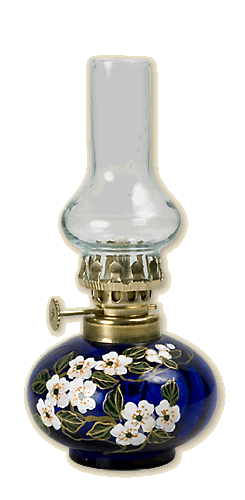 Table paraffin lamp, height about 15 cm. Burner made of polished, brass metal sheet. Green, ruby, amber and transparent colours of containers for paraffin are available. Its parts are brass, patina or polished. Straight or flounce chimney. Hand-painted container for paraffin with traditional plant motifs. Weight about 0.14 kg. |