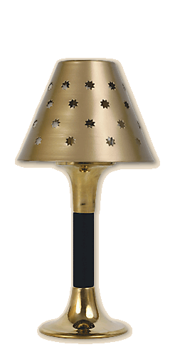 Table paraffin lamp with a base made of wood and polished brass. Lampshade made of polished sheet metal with star-shape slots. Illuminated from inside with a paraffin lamp, made of transparent glass. Its parts are brass, patina or polished. Height 24 cm, weight about 0.28 kg. |