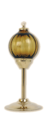 Paraffin lamp made of amber glass, on a high, brass stand. Green, ruby, cobalt and transparent colours are also available. Its parts are brass, patina or polished. Height 21 cm, weight about 0.15 kg.