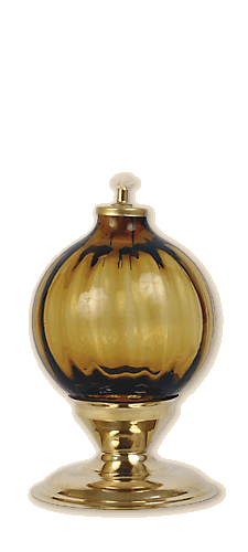 Paraffin lamp made of amber glass, on a short, brass stand. Green, ruby, cobalt and transparent colours are also available. Its parts are brass, patina or polished. Height 12 cm, weight about 0.1 kg.
