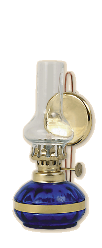 Table paraffin lamp with a glass container for paraffin in cobalt colour and brass mirror. Burner made of polished, brass metal sheet. Green, ruby, amber and transparent colours of containers are also available. Its parts are brass, patina or polished. Straight or flounce chimney. Height 13.5 cm, weight about 0.13 kg. |