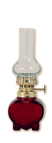 Table paraffin lamp with a ruby glass container for paraffin in the shape of a heart. Burner made of polished, brass metal sheet. Green, amber, cobalt and transparent colours of containers are also available. Its parts are brass, patina or polished. Straight or flounce chimney. Height 15 cm, weight about 0.1 kg. |